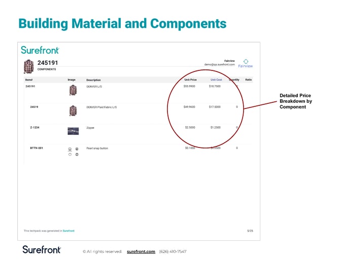 No need to manually list every component; Surefront does it for you. Your tech pack will include a complete breakdown of all materials, from fabrics to trims, ensuring smooth production.
