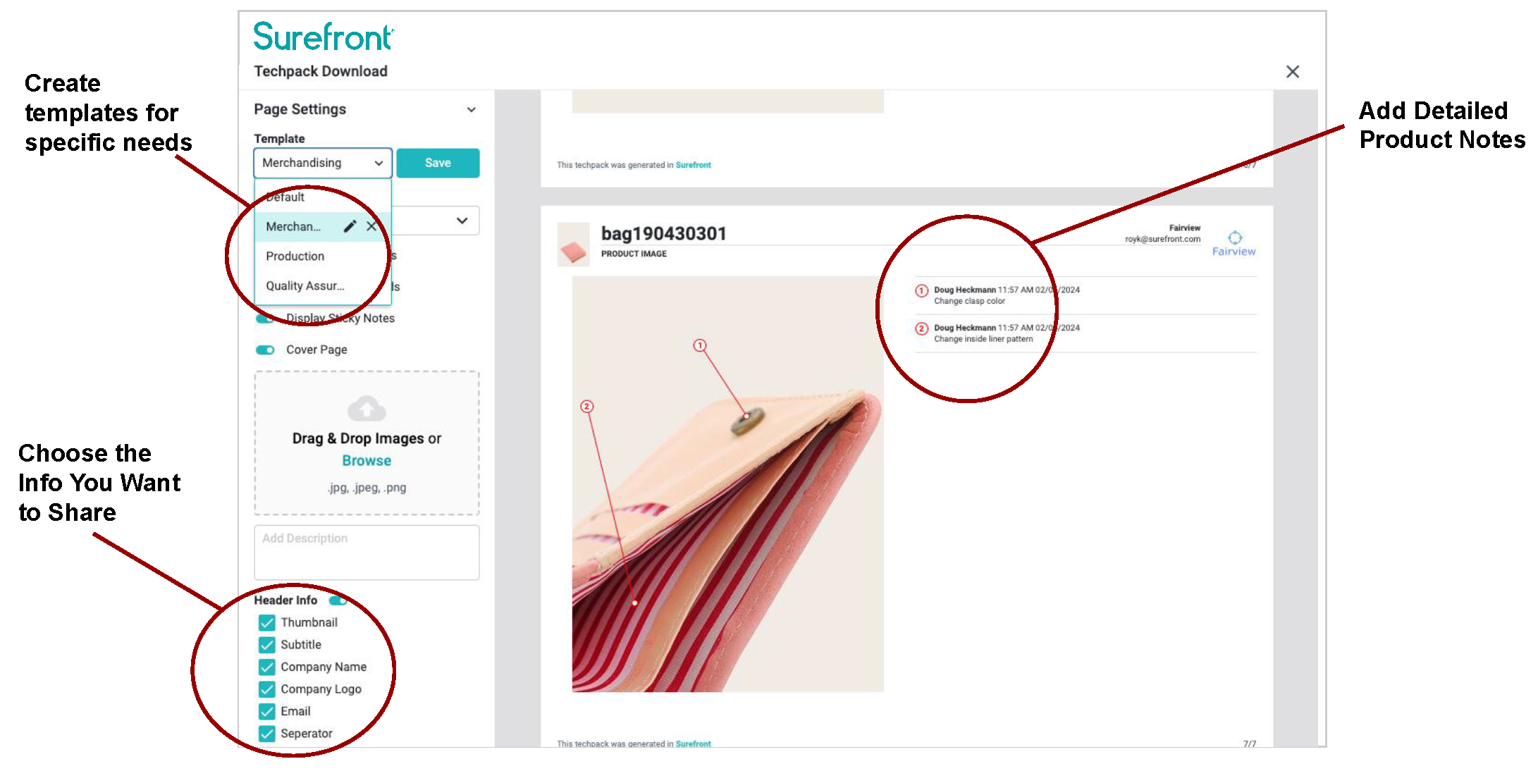 Creating Techpacks only take a couple of clicks. This is because teams using Surefront iterate and design product specs within the platform. So, when you need to generate Tech Packs for Clothing or any other product, you have all the data you need readily available. What you do next is incredibly simple.