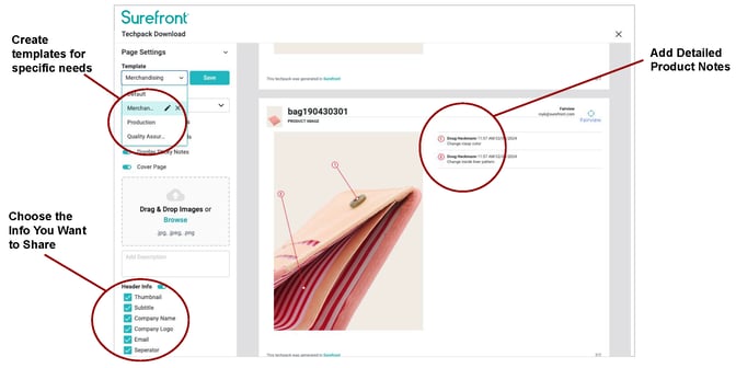 Whether you are a buyer optimizing margin and costs, or a production manager ensuring items are produced to specification, or a quality assurance professional completing testing, Surefront’s Techpack templates are key to your success.